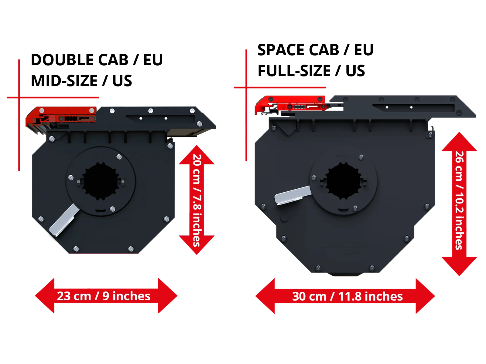 ✓ Design de Eixo Reforçado Posicionado estrategicamente dentro da área do canister, o eixo reforçado abriga com segurança a mola (S-Kit) ou o motor elétrico (E-Kit), garantindo proteção e vedação completas. Este design elimina a necessidade de espaço adicional no compartimento de carga para o motor, ao contrário dos concorrentes que o colocam em uma caixa lateral externa ou em um segundo eixo com um canister maior. Nossa solução mantém o motor seguro e fora do compartimento, maximizando o espaço de armazenamento e aumentando a durabilidade. | ✓ | ✓ | X |