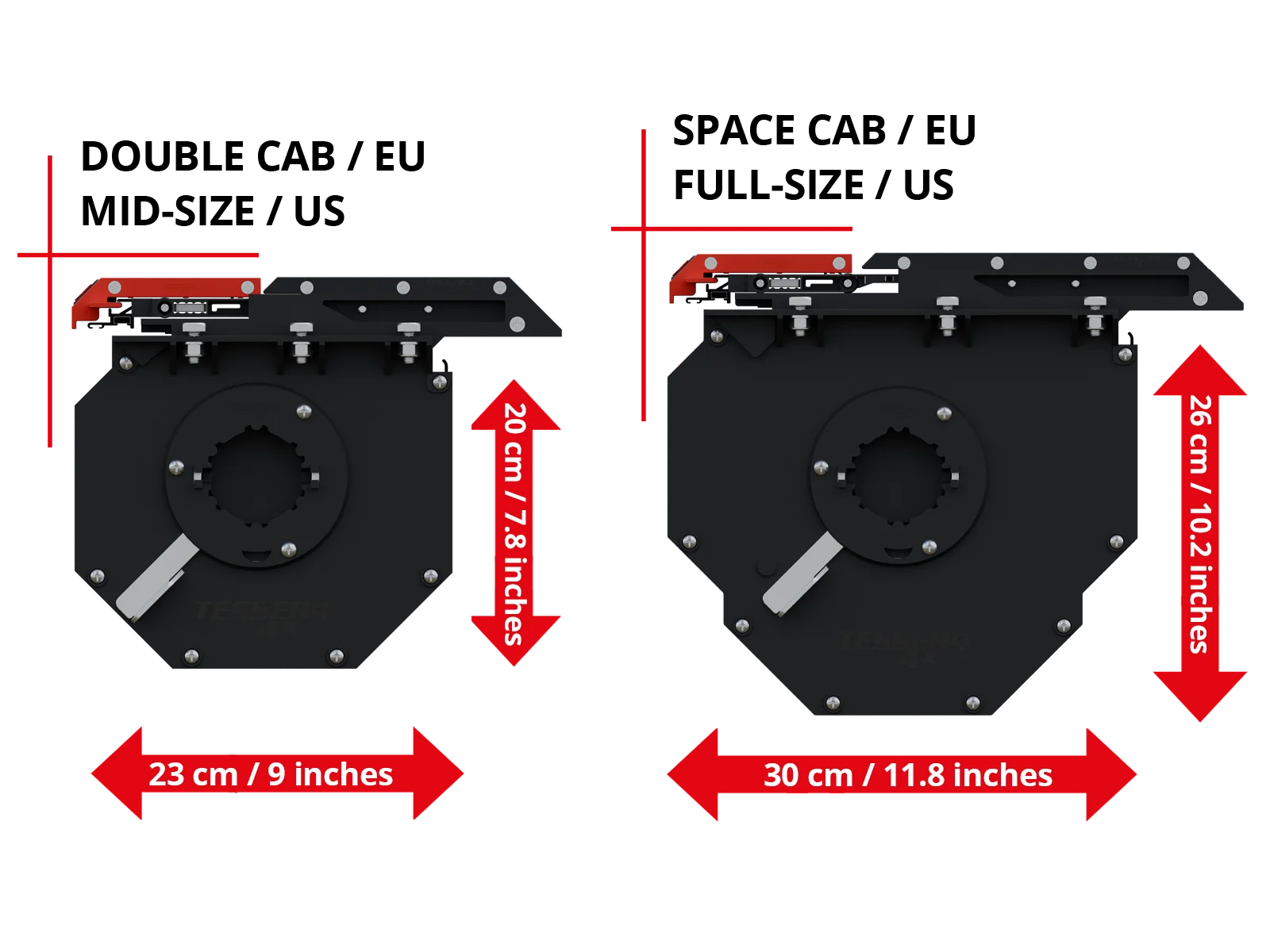 | ✓ Design Inovador e Compacto Com um design avançado, a lamela final se retrai suavemente para dentro da área do canister, juntamente com as menores dimensões de canister do mercado—apenas 20cm/7.8 inches x 23cm/9 inches (HxW) (ou 30cm/11.8 inches x 26cm/10.2 inches (HxW) para os modelos Space Cab/Single Cab/Americanos). Esta solução maximiza a capacidade de carga em comprimento e altura. Ao contrário dos concorrentes, onde a lamela final se estende além do canister, este design garante um uso mais eficiente do espaço sem comprometer a funcionalidade. | ✓ | ✓ | X |
